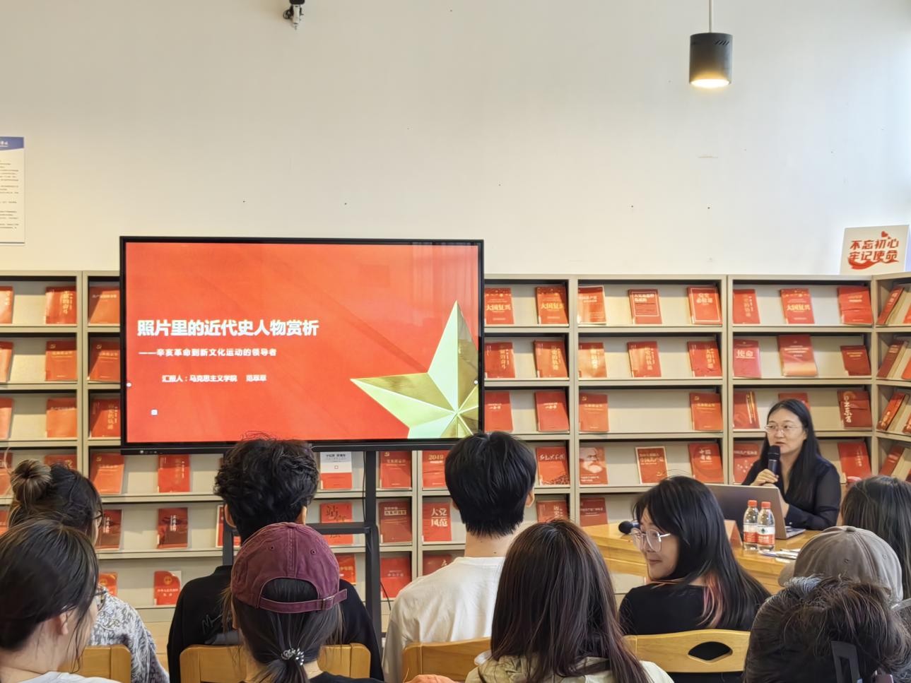 11月15日下午5:00,范翠翠老师在图书馆三楼“红色阅读角” 举办红色知识专题讲座,本期讲座的主题是照片里的近代史人物赏析!设计学院的积极分子到场聆听讲座并参与互动,氛围良好,同学们纷纷表示受益匪浅。(张家梅摄)