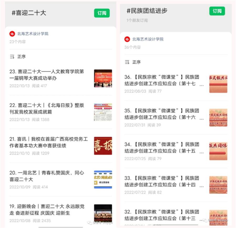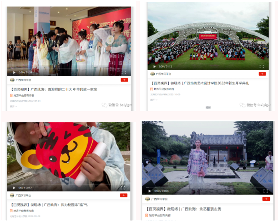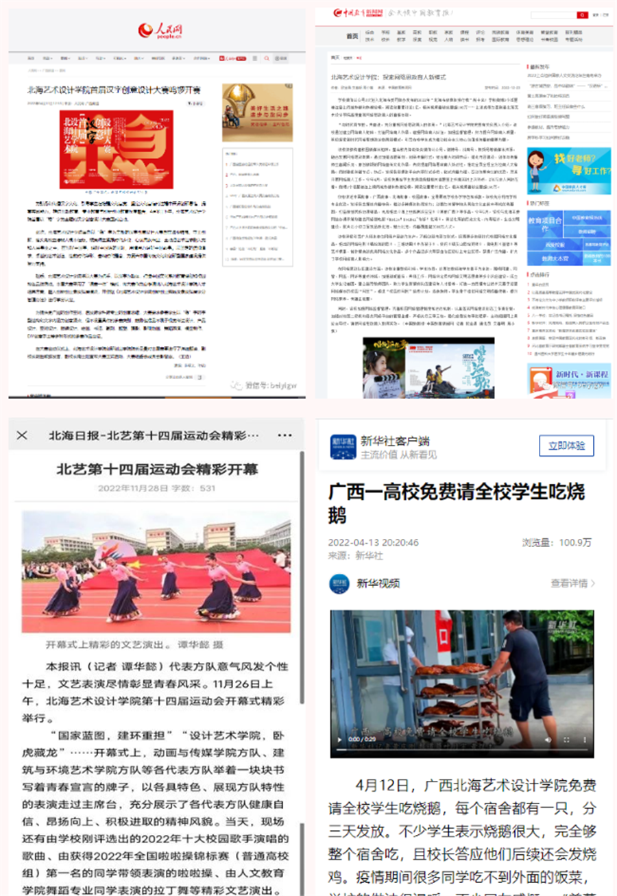 二是聚焦办学特色及成效展示学校新面貌。2022年,学校在人民网、学习强国、广西日报-广西云、广西新闻网、北海日报、北海广播电视台等多个省、市级主流媒体平台发布新闻累计112篇;北海日报刊发 重点稿件《不忘来时路,逐梦向未来——北海艺术设计学院创立22年实现跨越式发展》,深刻回顾学校办学22年来取得的显著成果。通过不断拓展与校外主流新闻媒体的横向联系,学校社会知名度、美誉度进一步提升。