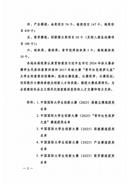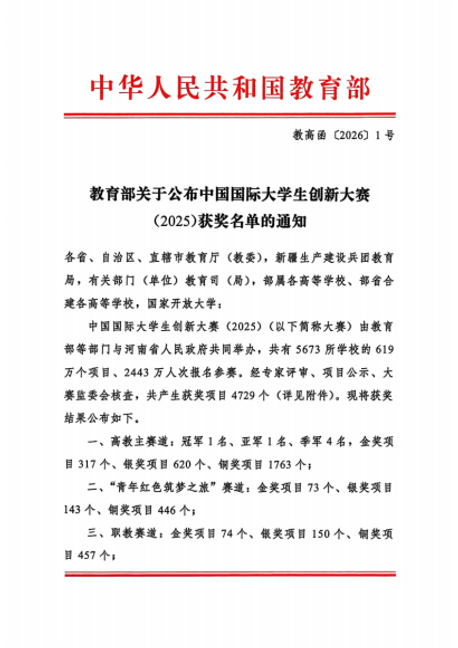 教育部印发《关于公布中国国际大学生创新大赛(2025)获奖名单的通知》(教高函〔2026〕1号)
