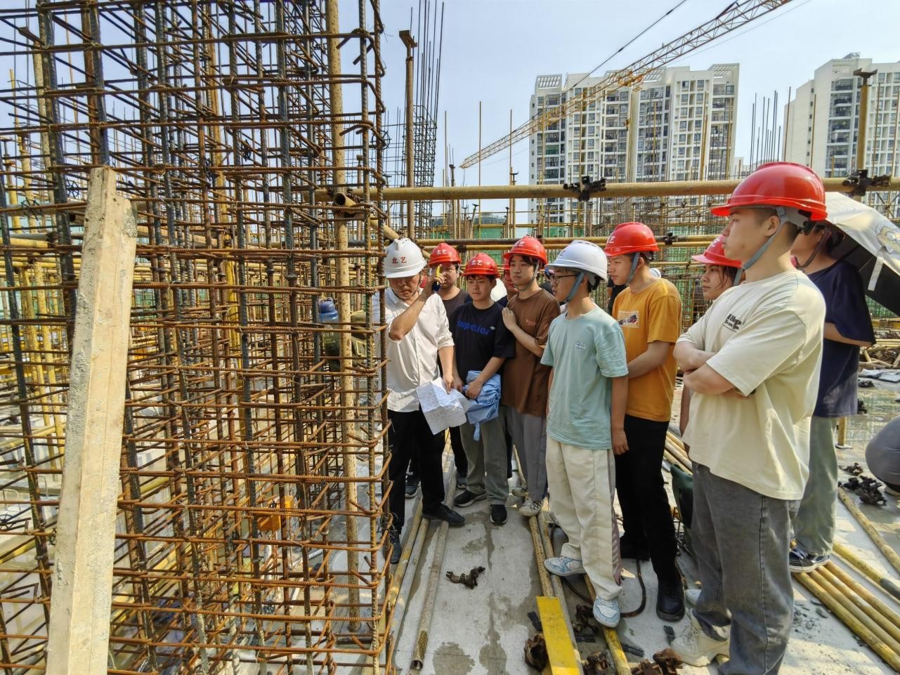 在施工现场,学生们首先听取了项目经理关于工程概况和钢筋施工要点的详细介绍。随后,在任课老师的带领下,学生们参观了钢筋加工区、绑扎区和焊接区等关键施工区域。他们仔细观察了钢筋的切割、弯曲、连接等施工工序,并就施工中的难点和疑问与现场工人和任老师进行了交流。