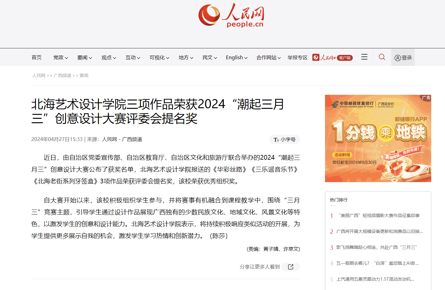 人民网:北海艺术设计学院三项作品荣获2024“潮起三月三”创意设计大赛评委会提名奖