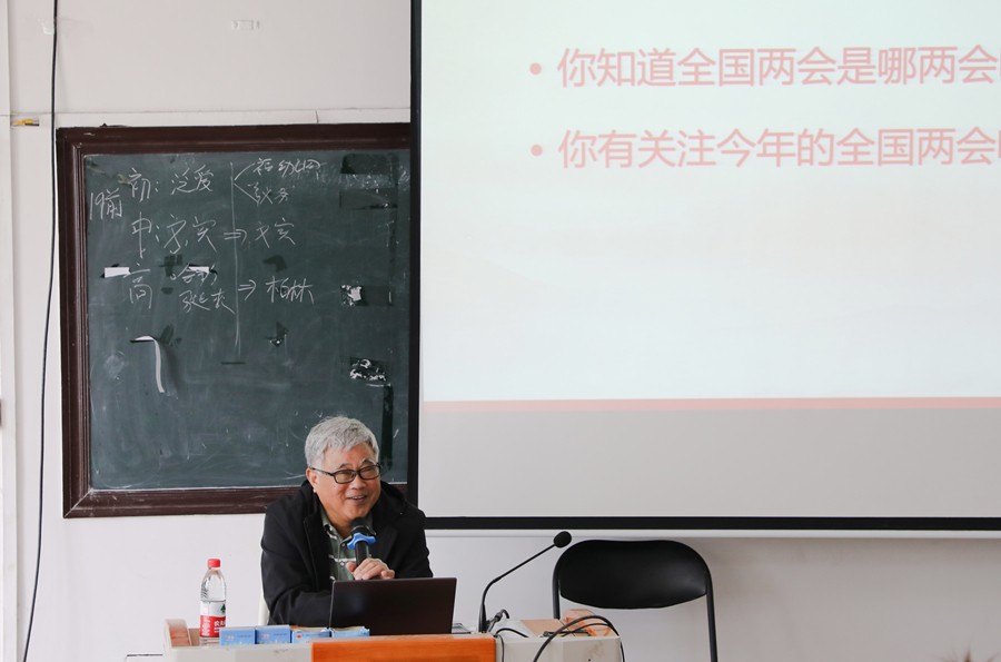 据了解,本学期大四学生形势与政策课安排《2024年全国两会精神解读》《当前就业形势与实施就业优先战略》两个专题教学。课上,姜献生教授主要从2024年政府工作报告要点和两会热词为切入解读2024年两会精神,引导学生正确理解与掌握国家大政方针。紧接着,张广科副教授主要介绍了我国当前就业形势“总体稳中向好”,以及面对就业压力国家实施的一系列效果明显的稳就业政策;他鼓励大学生树立就业信心,要敢于发挥优势,勇于担当责任,多渠道、多层次、多形式尽快实现就业。现场学生均兴趣盎然,雷鸣般的掌声连续不断,整体效果反映良好。