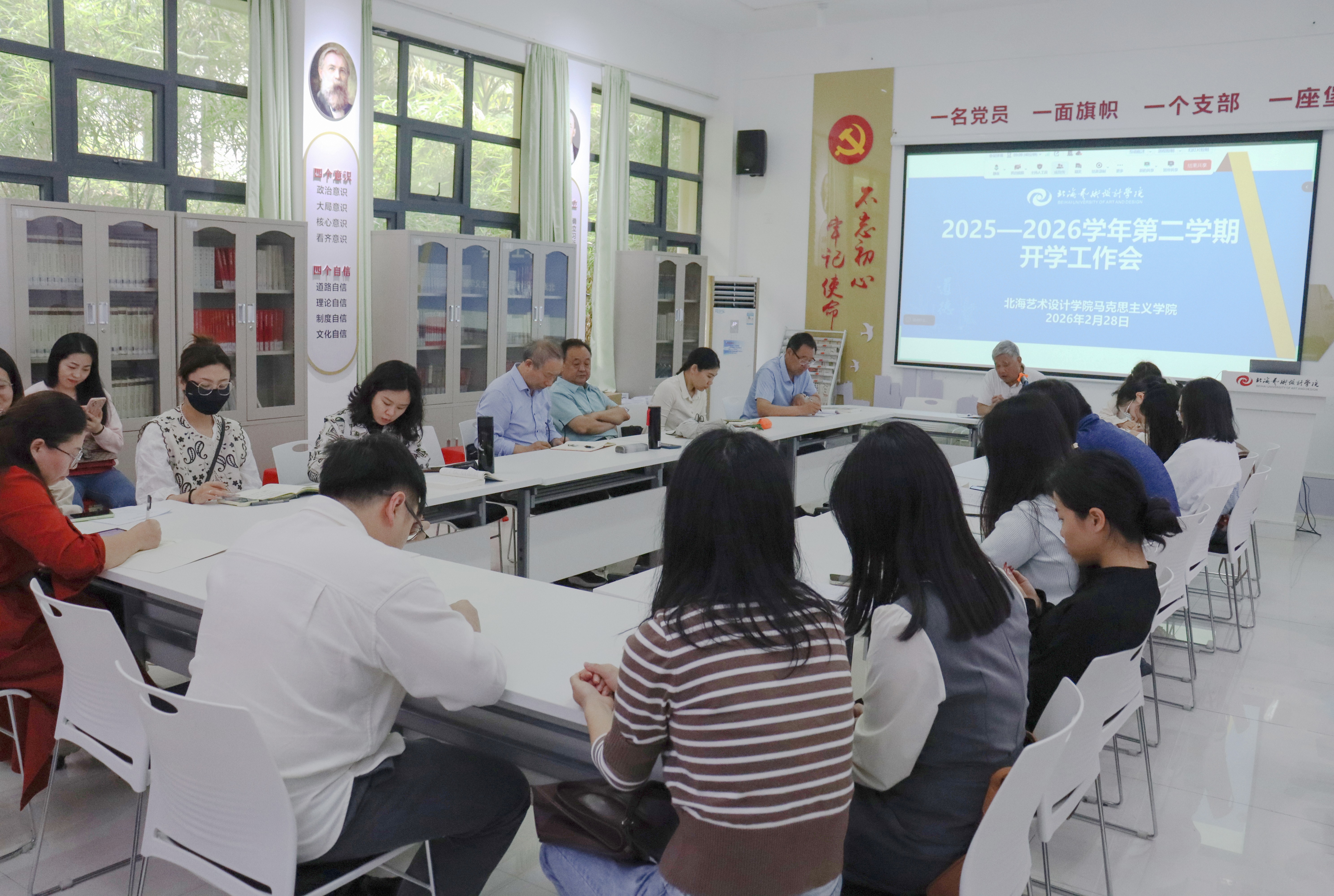 会上,他着重强调以下五项任务:一是坚持以习近平新时代中国特色社会主义思想统领思政课,坚持北艺马院四位八化五结合教学模式,不断筑牢教学根基;二是深化思政与专业双向融合,用好北艺校园特色文化,培养德才兼备的社会主义人才;三是鼓励教师善用活用人工智能辅助教学,创新教学方式方法;四是持续举办第三期马克思主义经典著作读书活动,引导教师多参与、多研讨、多思考,进一步提升中青年教师的理论素养;五是做好2026年的思政专项课题的申报立项工作以及教学竞赛活动的组织。同时,他还要求全体教师严守党纪党规,严守党章要求,严守新时代高校思政课教师行为规范准则。最后,他寄语全体教师:新学期课越上越好、科研越做越强、成绩越来越多,合力实现优秀北艺马院的目标。