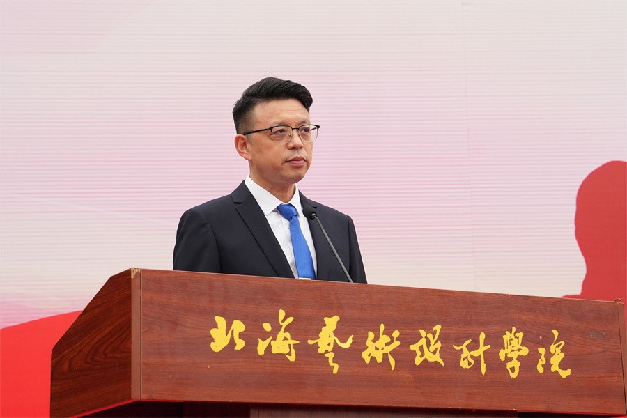 动员大会上,我校卢新华校长向北海海城区人民武装部领导授军训团团旗并宣布2023级学生军训开训。(周小琪、郭松、王弘武、周雨晨、高闻雨、相恒佳/摄)