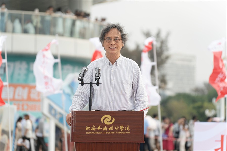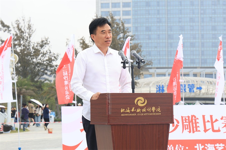 卢新华校长在致辞中表示,建校以来,学校全面贯彻党的教育方针,以立德树人为宗旨,秉持“道德为本、艺术求精”的办学理念,坚持高质量发展,形成了“以德铸魂、以文化人、以美化人”的育人模式。沙滩运动会和沙雕比赛是学校育人模式的组成部分。他指出,艺术与体育是互动的,艺术赋予美的创造和追求,体育赋予强健的体魄和拼搏精神。在艺术的世界里,北艺师生用创造之美描绘梦想,用创意点亮生活;在体育的赛场上,大家用强健的体魄书写青春,用拼搏精神铸就辉煌。艺术关乎国家文化兴衰,体育关乎国家强盛,都承载着民族振兴的梦想。卢新华校长期望广大师生在此次沙滩运动会和沙雕比赛中秉持“友谊第一,比赛第二”的体育精神,赛出风格,赛出水平,尽情发挥创意,展现独特的艺术风格和深刻的思想内涵,用拼搏汗水和优异的成绩书写精彩的青春篇章,用艺术与体育的精神和力量,为北海艺术设计学院的明天增光添彩!