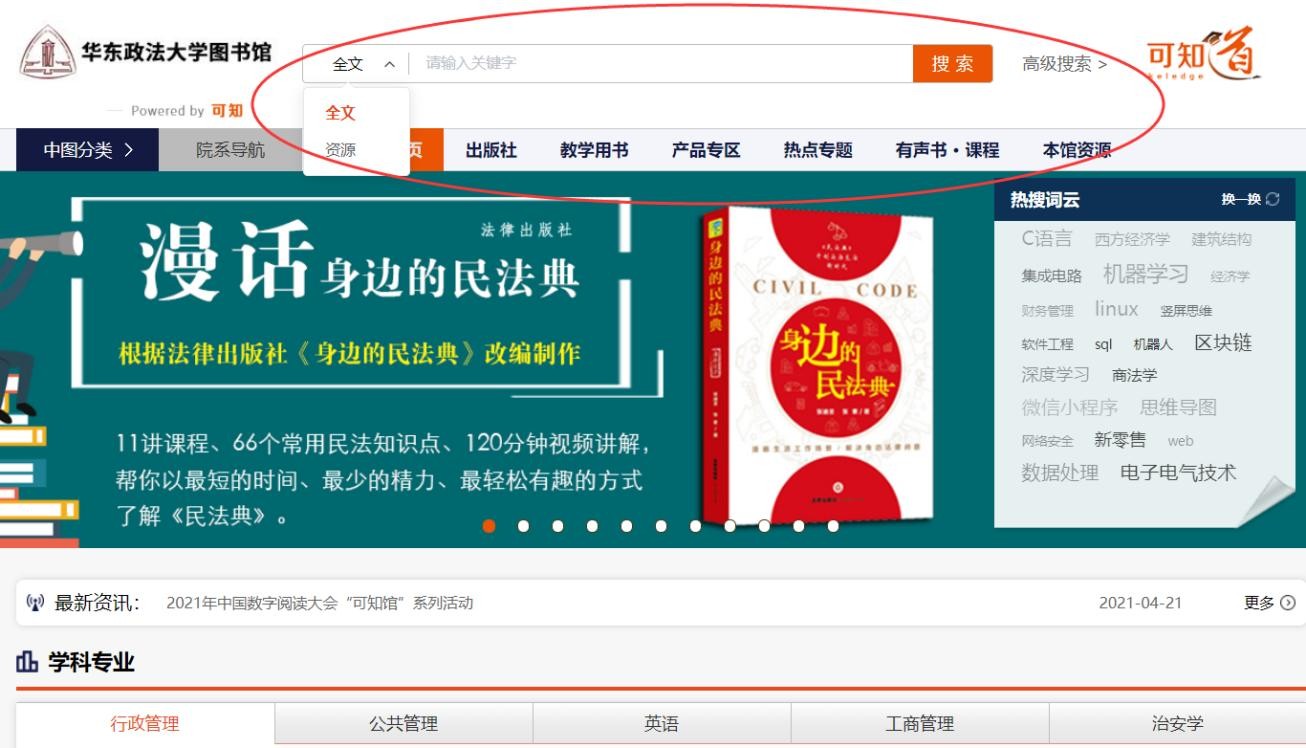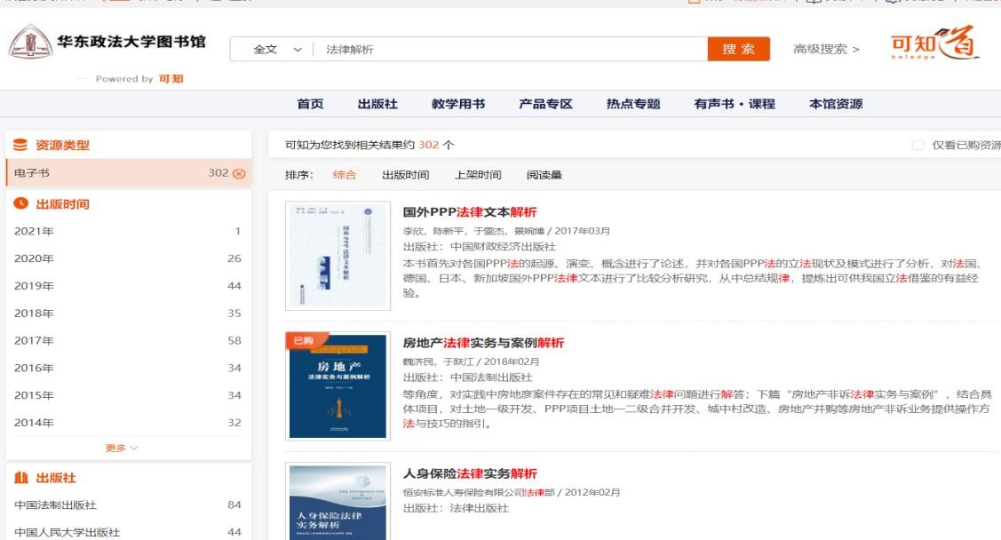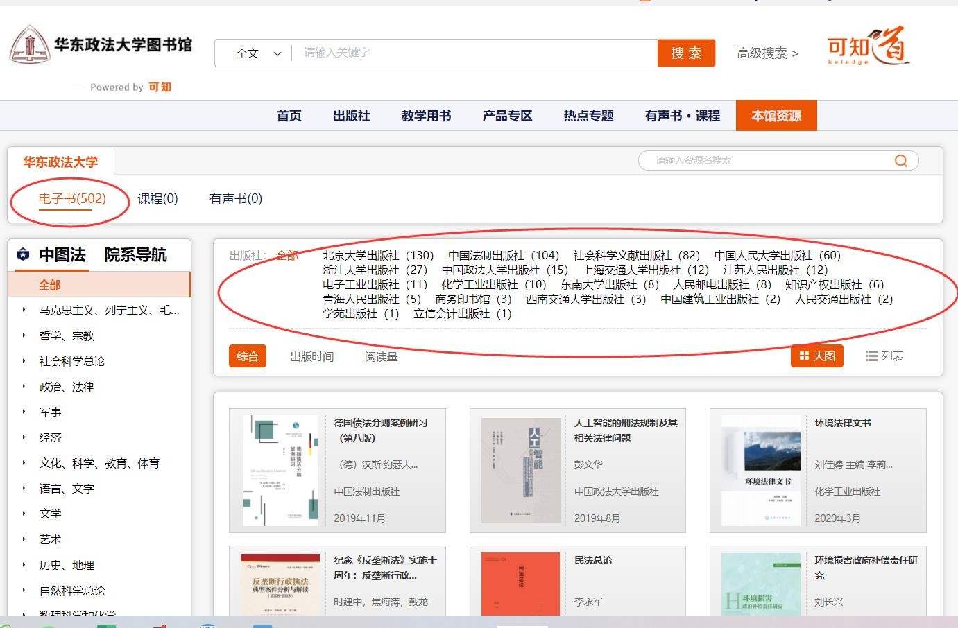 可根据院系专业分类或通过关键字、出版社、作者、ISBN进行资源检索和查找。