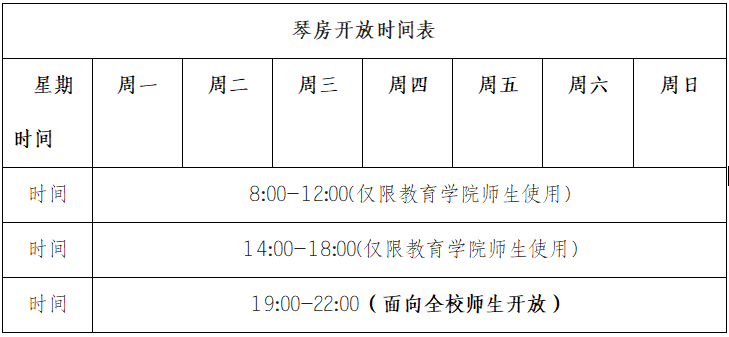 时段一(8:00-12:00、14:00-18:00):仅限教育学院学前教育专业师生使用;其他学院师生若需在此时段申请使用,须提前联系琴房管理人员预约,经琴房管理人员同意后方可使用。