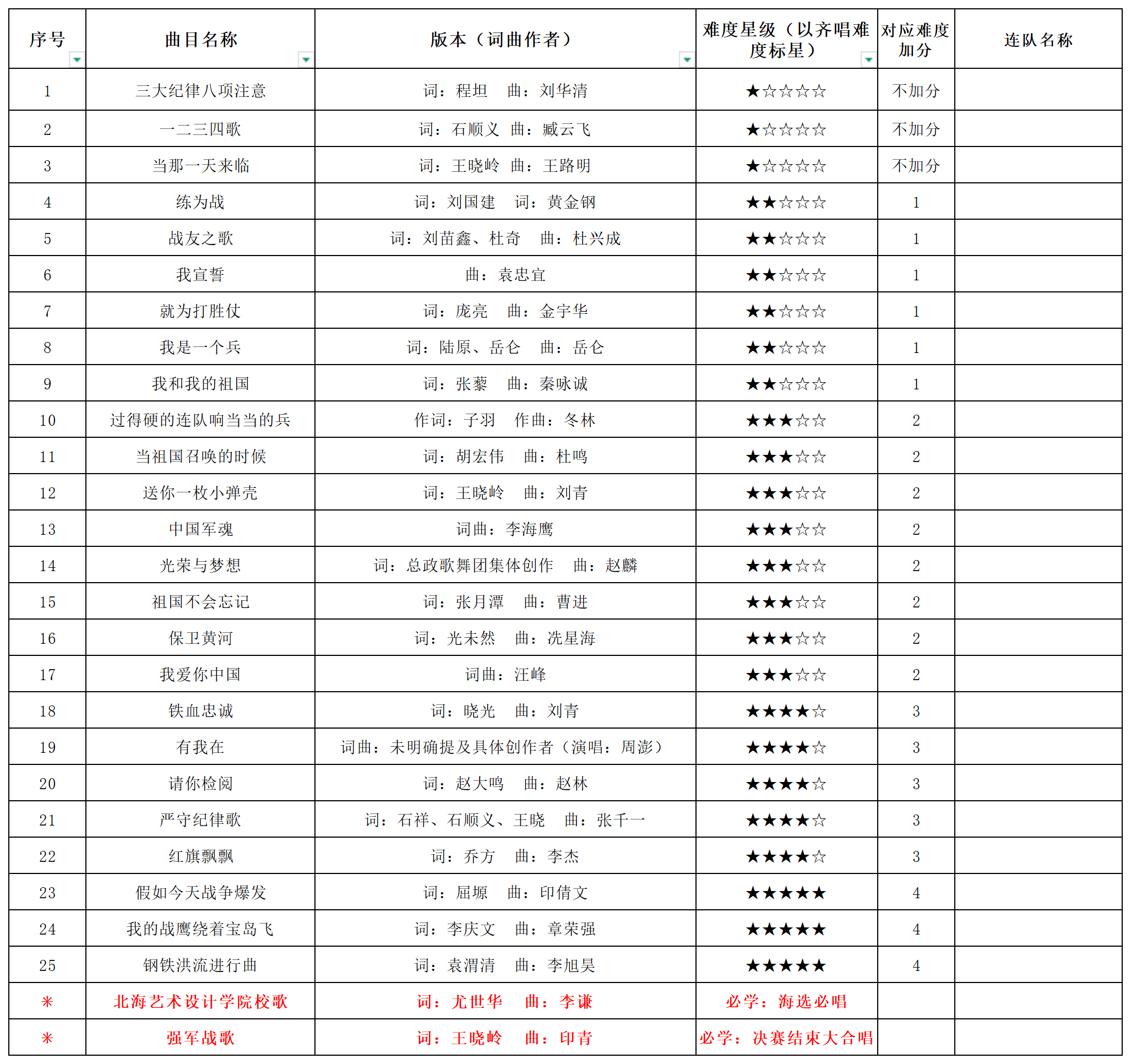 初赛各连队需要同时演唱2首歌曲,分别为北海艺术设计学院校歌和曲库抽定曲目。校歌演唱效果纳入初赛评分,进入决赛的连队仅演唱曲库抽定曲目。