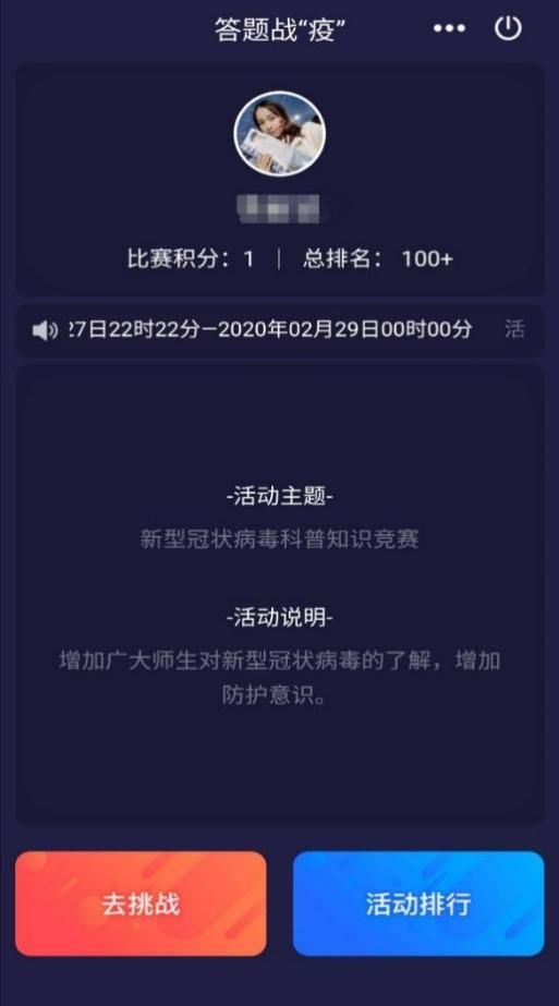 值此二十大召开之际,为进一步激发广大学生爱党爱国热情,增强同学们奋发进取、砥砺前行、报国圆梦的信念,图书馆特开展喜迎二十大答题活动本次活动题目主要围绕党的二十大这一主题,每人每次答题5道题目,答对1题获得20分,满分100分,答错题不会倒扣分,每位同学每日仅能作答一次,作答次数上限为10次。