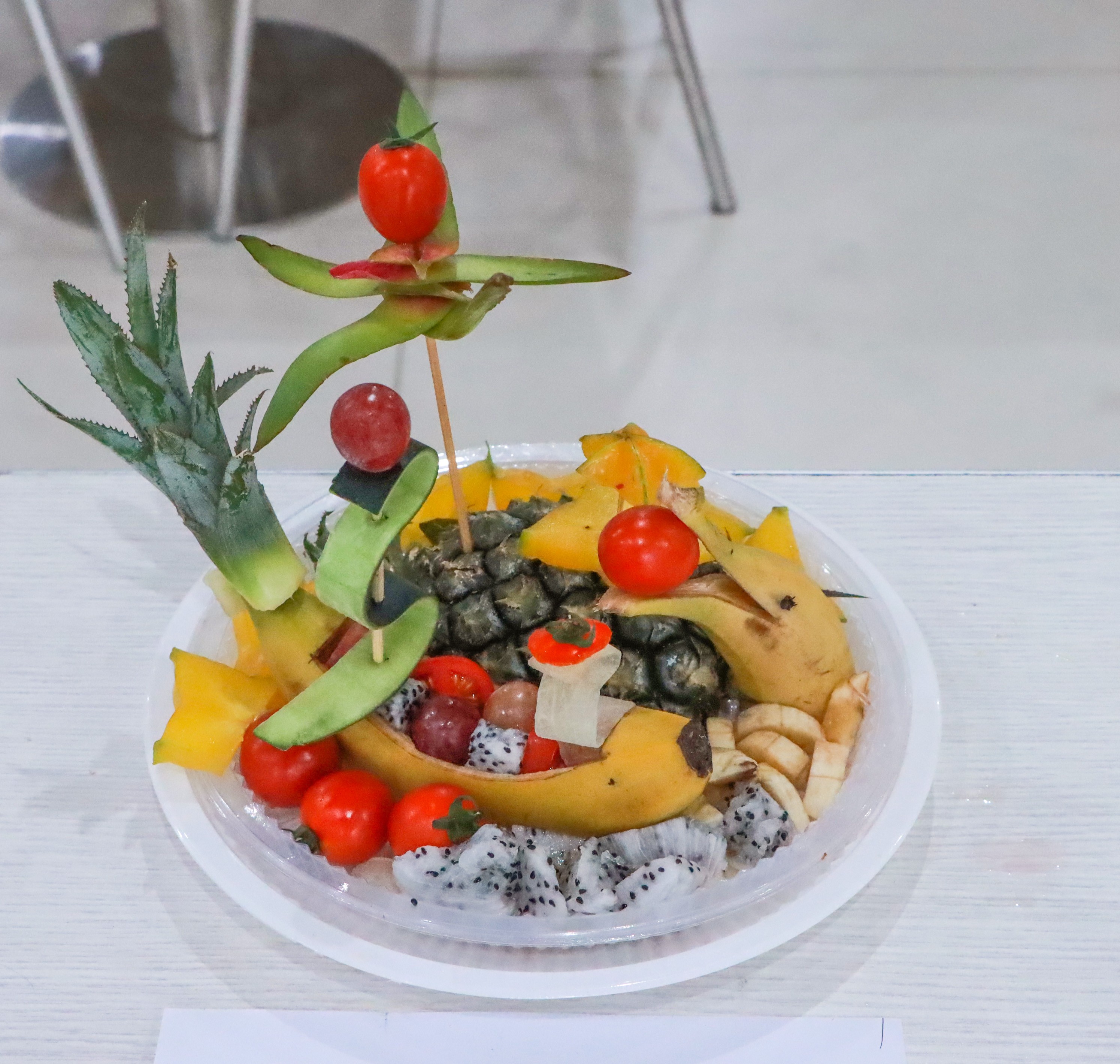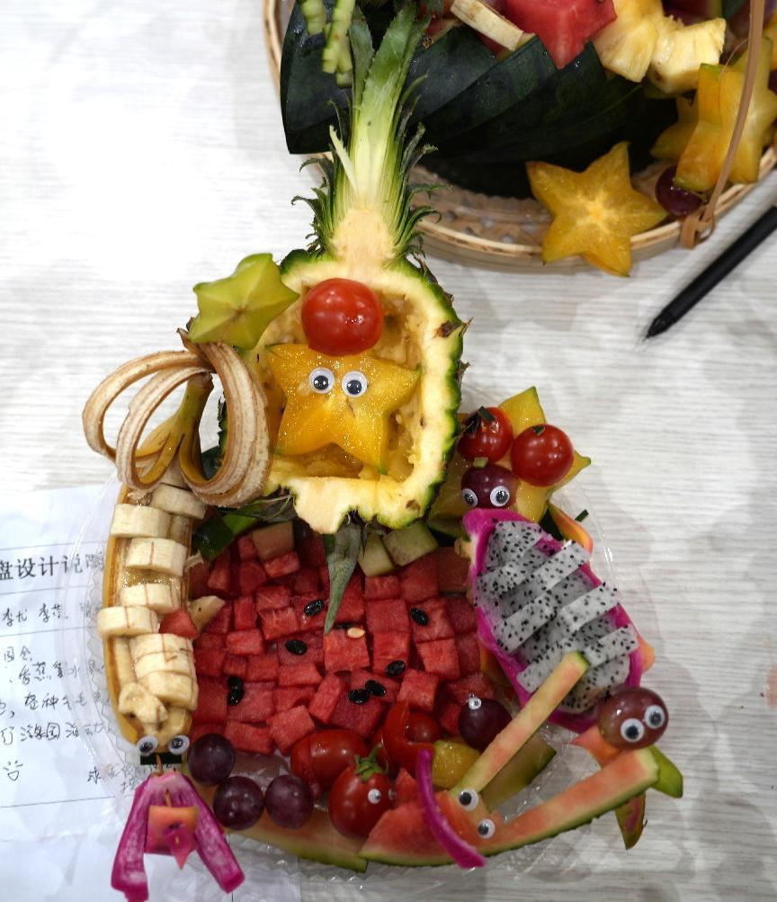 比赛正式开始,选手们将以“创新、环保、美观”为设计理念,进行水果拼盘的制作。现场氛围进入另一个高潮,选手们热情洋溢,在有限的水果种类限制下,有的手握水果刀,麻利地切着水果,有的将切好的水果摆放着各式各样的造型,大家团结协作,用他们灵巧的双手,充分发挥想象力和创造力,让人叹为观止,力求展现给大家别出心裁的水果拼盘作品。