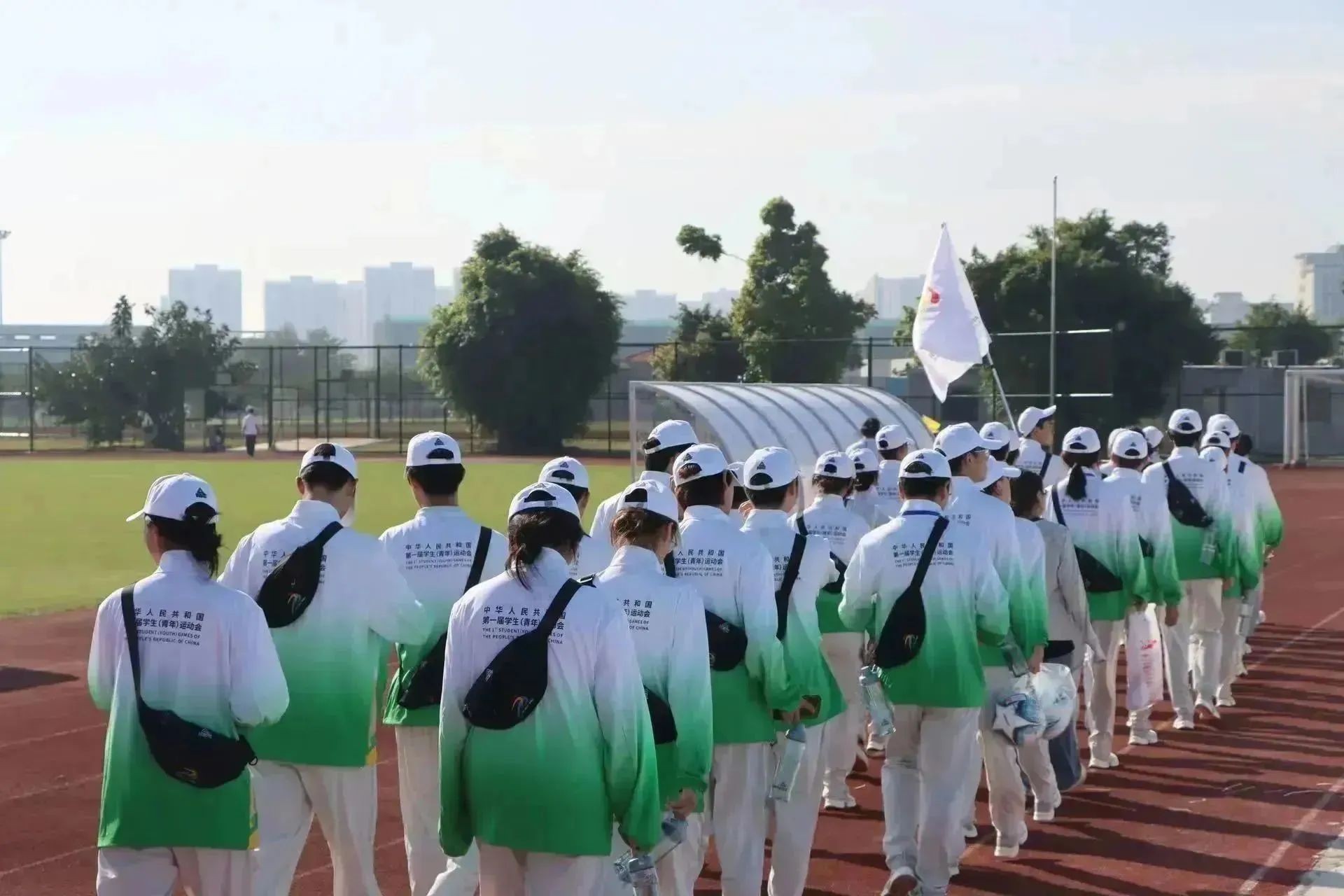 手举学青会会旗