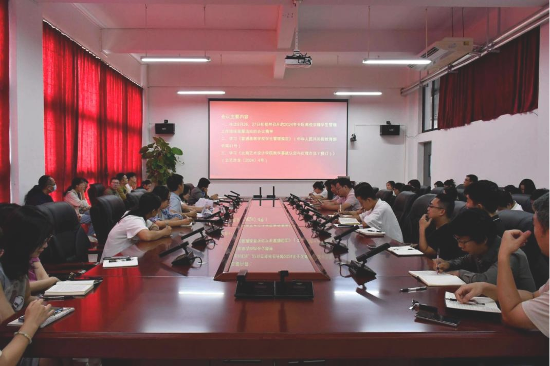 会上,陶立阳副校长传达了2024年全区高校学籍学历管理工作现场观摩活动的会议精神,学习解读了《普通高等学校学生管理规定》(教育部令第41号)的条文精神和实际应用案例强调新生入学资格审查与复查的重要性,指出注册学生学籍、学历、发放毕业证和学位证等工作务必严格按照国家法律法规及学校相关制度要求执行。会上还学习了《北海艺术设计学院教学事故认定与处理办法(修订)》(北艺质发〔2024〕4号),指出教师和教学管理人员应严格遵守教学管理制度和教学纪律,减少教学工作中各类事故的发生,教学事故认定应按该办法执行,教学事故处理应建立一套成熟的应急处理流程。