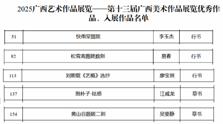 第十三届广西艺术作品展览是由广西壮族自治区人民政府主办,是全区最高水平的艺术作品展览。在2025广西艺术作品展览——第十三届广西书法(篆刻)作品展览中,我校书法学院教师李玉杰、易春、廖宝祺、江威龙,2023级学生吴雯静作品入展。