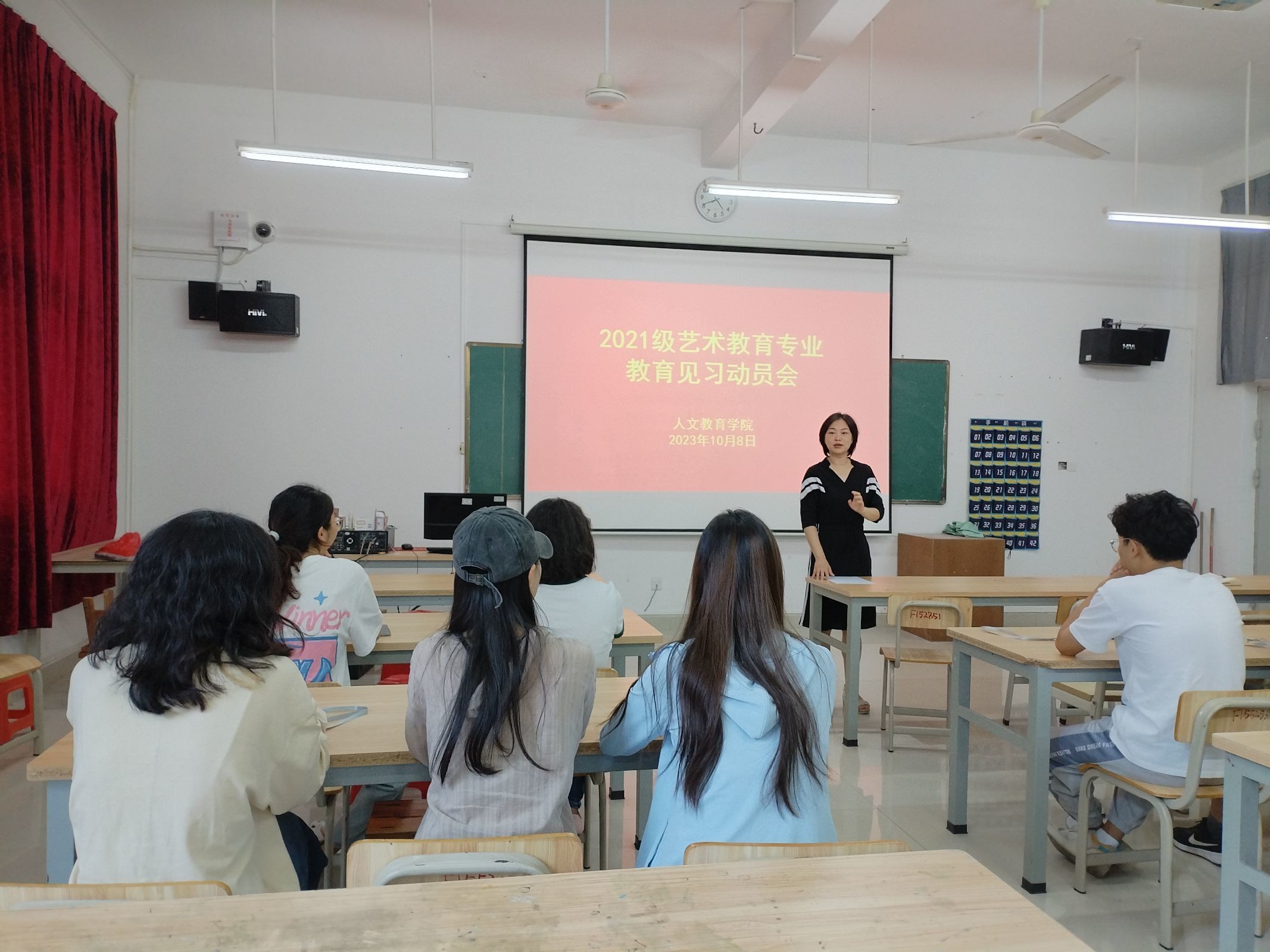 教育见习活动开始前,艺术教育教研室主任孙嘉昕为2021级艺术教育专业学生开展了教育见习动员会,会上为学生们介绍了教育见习的目标和要求,人文教育学院副院长李谦也为见习的学生提出了专业要求与期望。