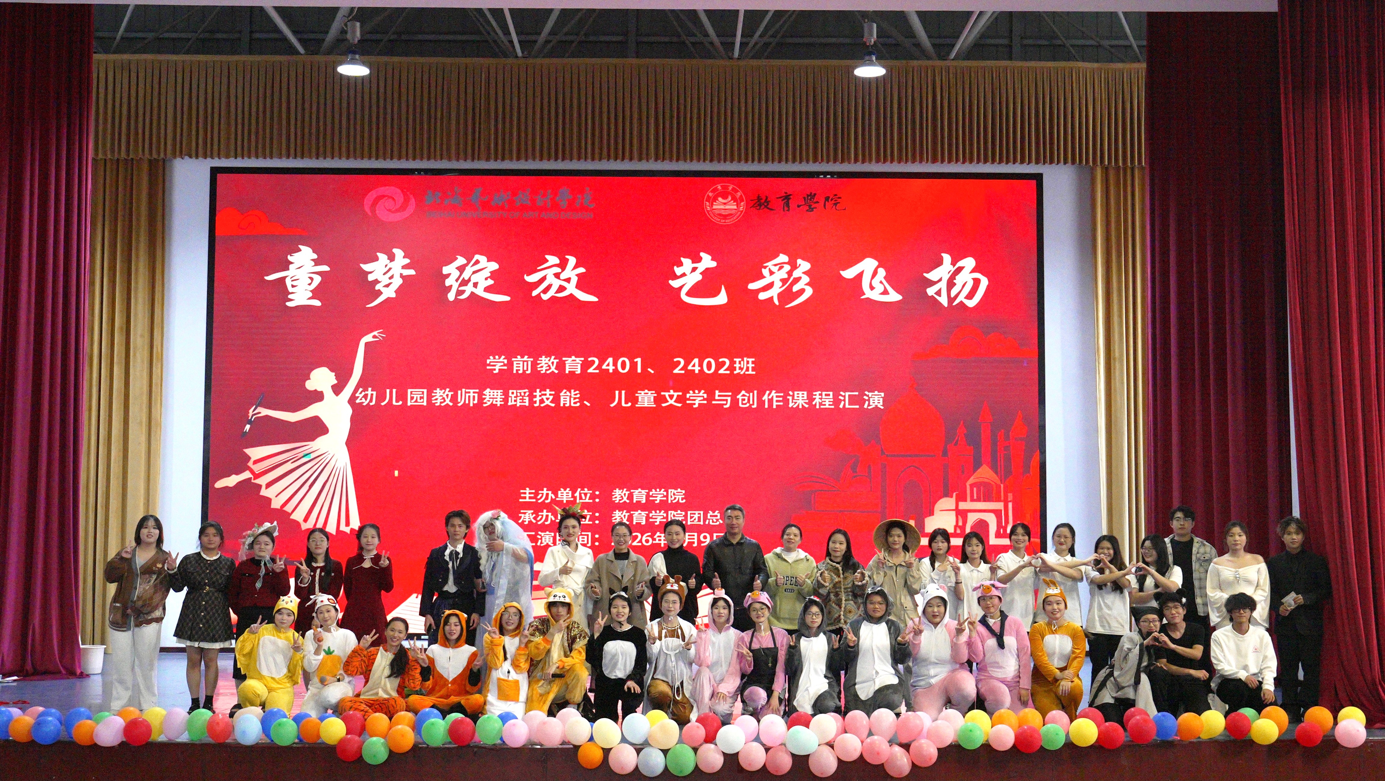 2026年1月9日,教育学院“童梦绽放·艺彩飞扬”学前教育专业2024级幼儿园教师舞蹈技能、儿童文学与创作期末结课汇演在学校西校区大礼堂举行。教育学院院长熊秀峰、副院长蒙剑英、教务办主任黄海林、学前教育教研室主任覃思、团总支书记陈美霖及2024、2025级全体学前教育专业学生出席本次活动舞蹈学院常务副院长邓欢、舞蹈学院副院长李谦莅临出席和指导。