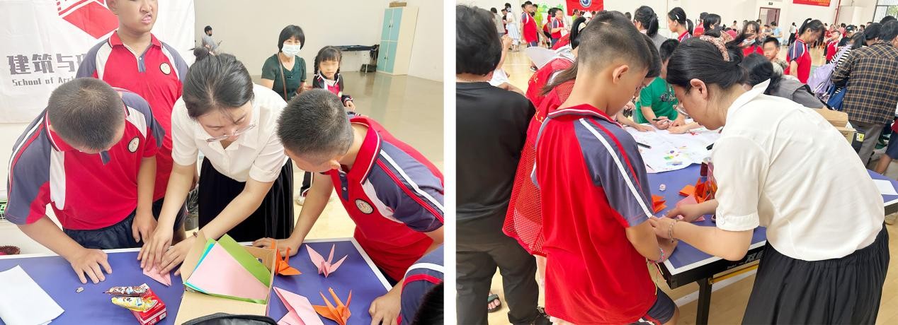 在手工折纸环节,我院教师代表提前准备了彩纸、剪刀等材料,协同同学们折叠纸飞机、小青蛙、千纸鹤等简单有趣的手工作品,采用一对一的辅导方式,通过手势、示范和鼓励,帮助他们完成作品。