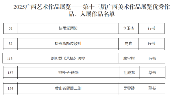 广西艺术作品展览由广西壮族自治区人民政府主办,是全区最高水平的艺术作品展览。在2025广西艺术作品展览——第十三届广西书法(篆刻)作品展览中,书法学院教师李玉杰、易春、廖宝祺、江威龙,2023级学生吴雯静作品入展。