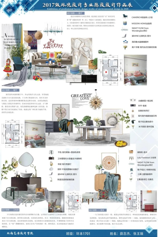 课程最终的设计任务是以疫情期间学生生活的居室空间环境为载体,以服务地区经济为己任,以反映其生活当地的特色地域文化为设计素材,完成一套具有地域特色家居陈设设计方案,其中包含方案的成本预算。同学们的作品大部分表现优良,能反映出学习态度端正和娴熟使用新的设计软件,设计理念先进,制作细致认真,具备发现问题、分析问题和解决问题的能力。学生对于陈设设计的课程体系及设计原理掌握较为深入具体,作品主题突出,风格鲜明,图示表现符合市场需求,顺利地完成了本次课程的教学任务。
