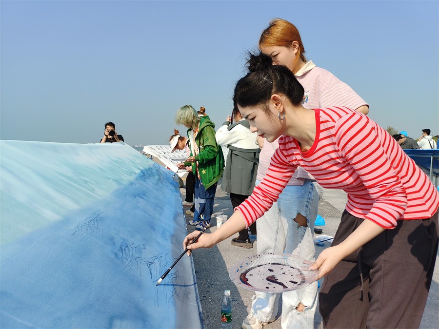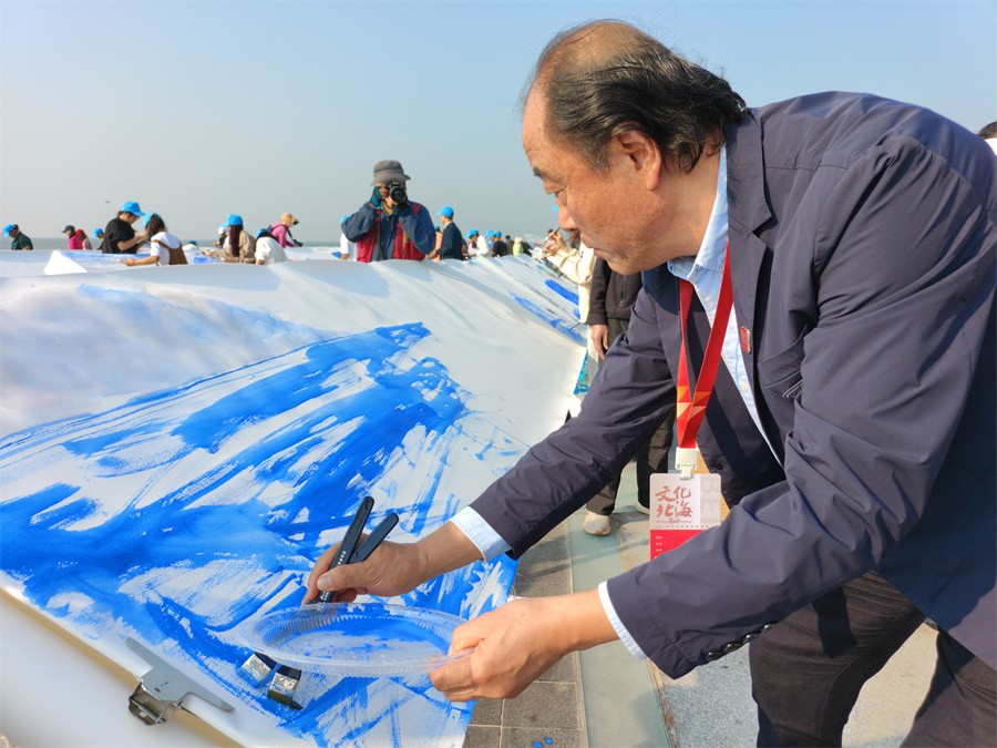 在创作现场,我校美术学院师生手握画笔,面朝大海。以十人为一组,以各自的绘画技巧和独特的创意,以他们无比的激情和活力共同绘就一幅幅10米长卷的画作。他们用色彩和线条,勾勒出了北海的美丽景色和银滩的独特魅力,将银滩潮雕广场变成了一个艺术的海洋,与面前的银滩碧波相映生辉,也为2023年“文化北海”建设活动周增添了一抹青春的色彩。